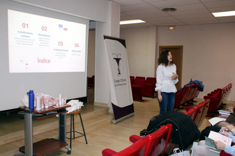Angela Soriano, enfermera y actualmente especialista de producto en incontinencia en Bimédica, dio la sesión, siendo presentada por la directora técnica del COF, Nieves Lázaro-Carrasco Delgado.