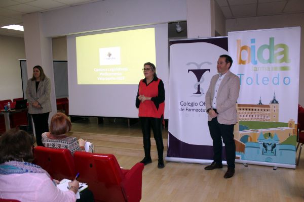 La ponente de la charla ha sido Pilar Fernández Rasco, veterinaria y responsable de Farmascotas en Bidafarma, a quien presentaron los vocales de Oficina de Farmacia y Distribución del COF de Toledo, respectivamente, María Victoria del Vigo y Fernando Soto.